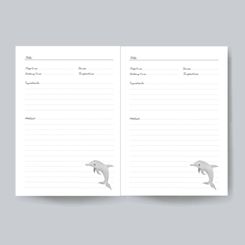 Each page has space for prep time, cooking time, serving information, cooking temperature, ingredients and method.