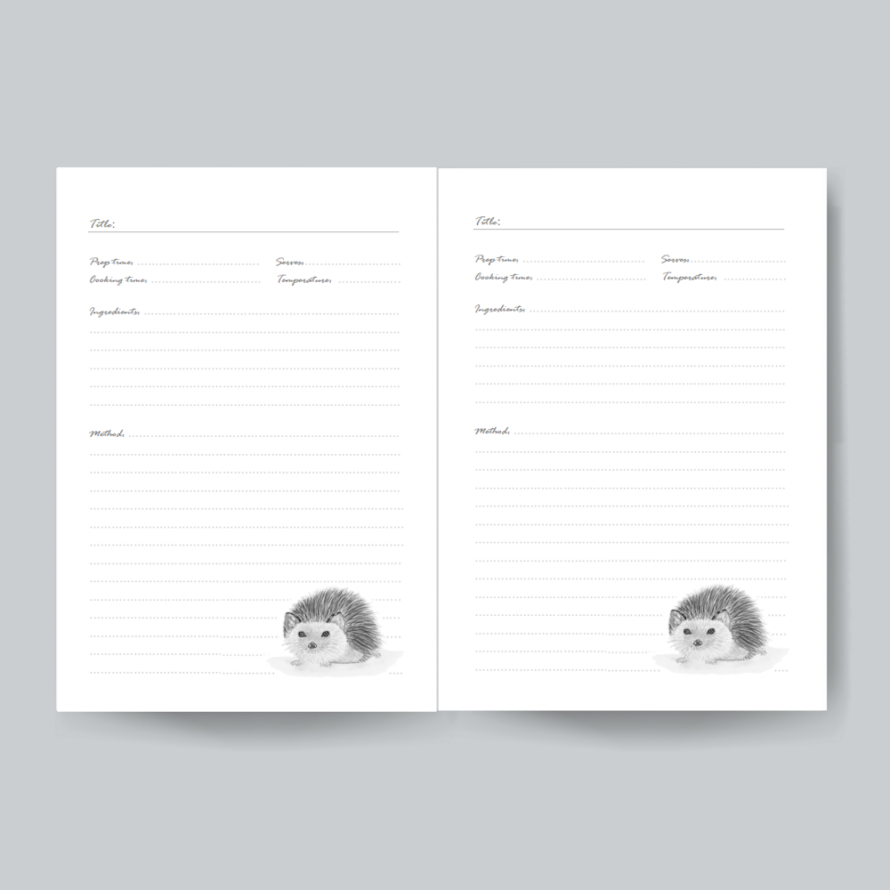 Each page has space for prep time, cooking time, serving information, cooking temperature, ingredients and method.
