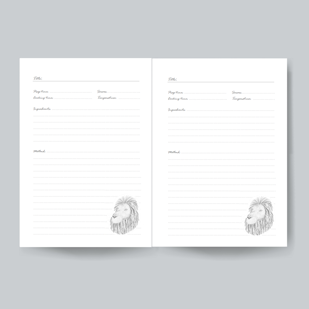 Each page has space for prep time, cooking time, serving information, cooking temperature, ingredients and method.