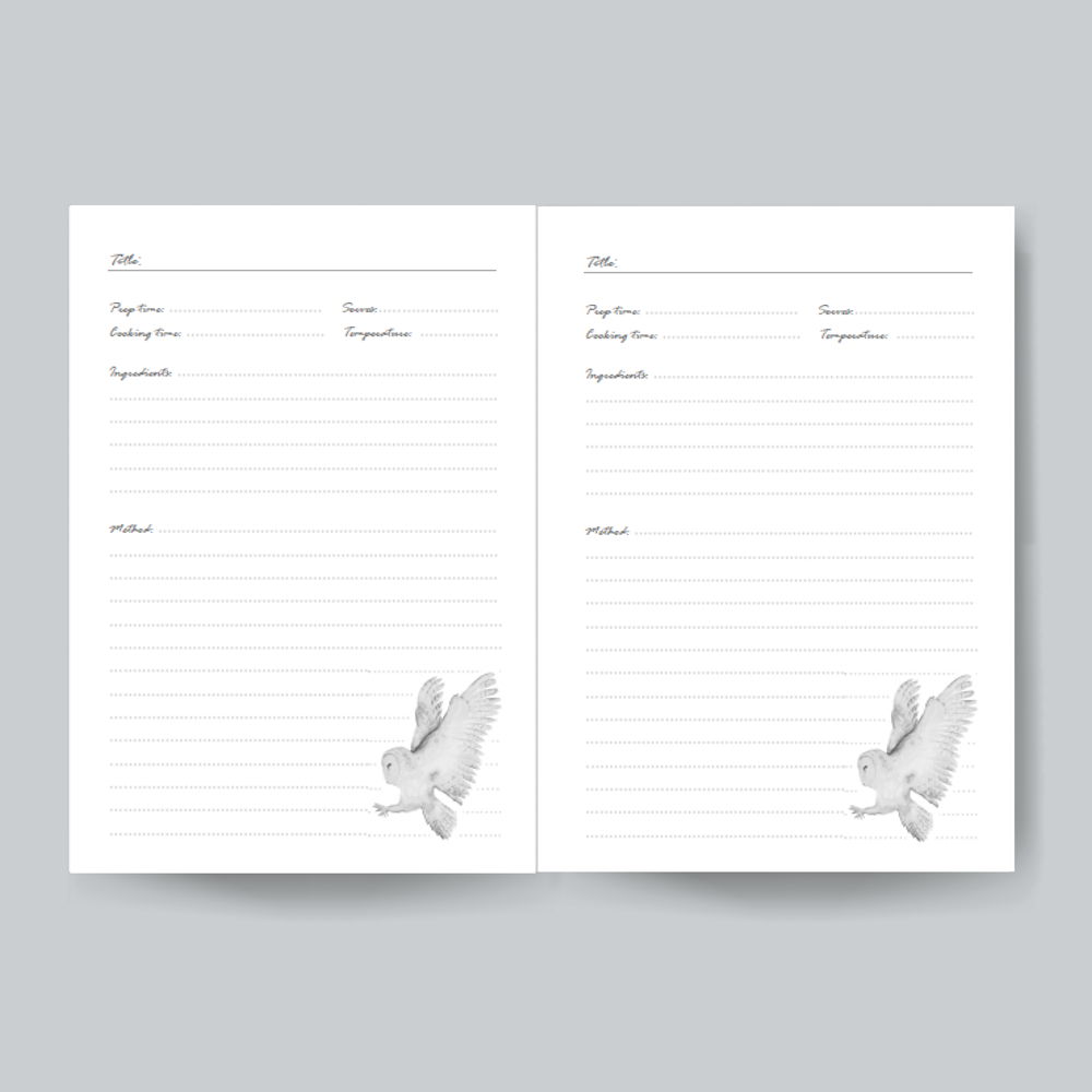 Each page has space for prep time, cooking time, serving information, cooking temperature, ingredients and method.