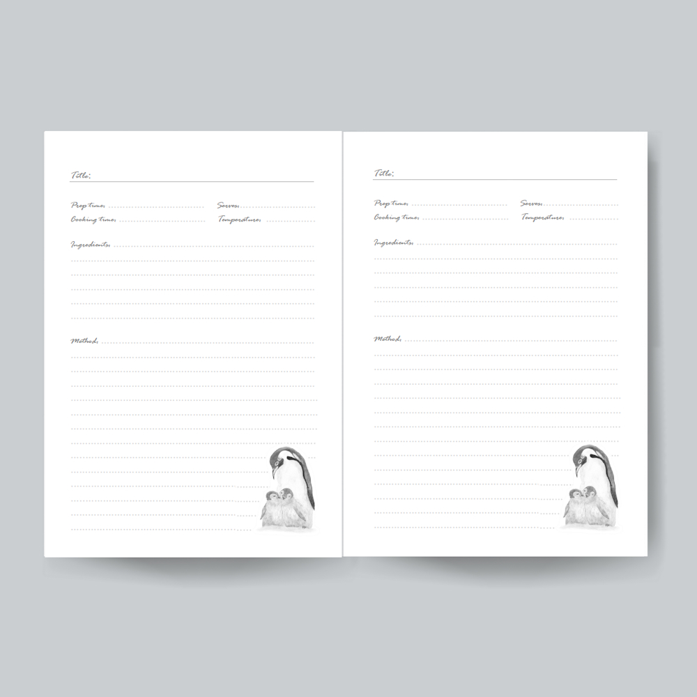 Each page has space for prep time, cooking time, serving information, cooking temperature, ingredients and method.