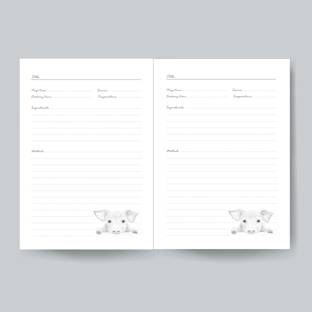 Each page has space for prep time, cooking time, serving information, cooking temperature, ingredients and method.