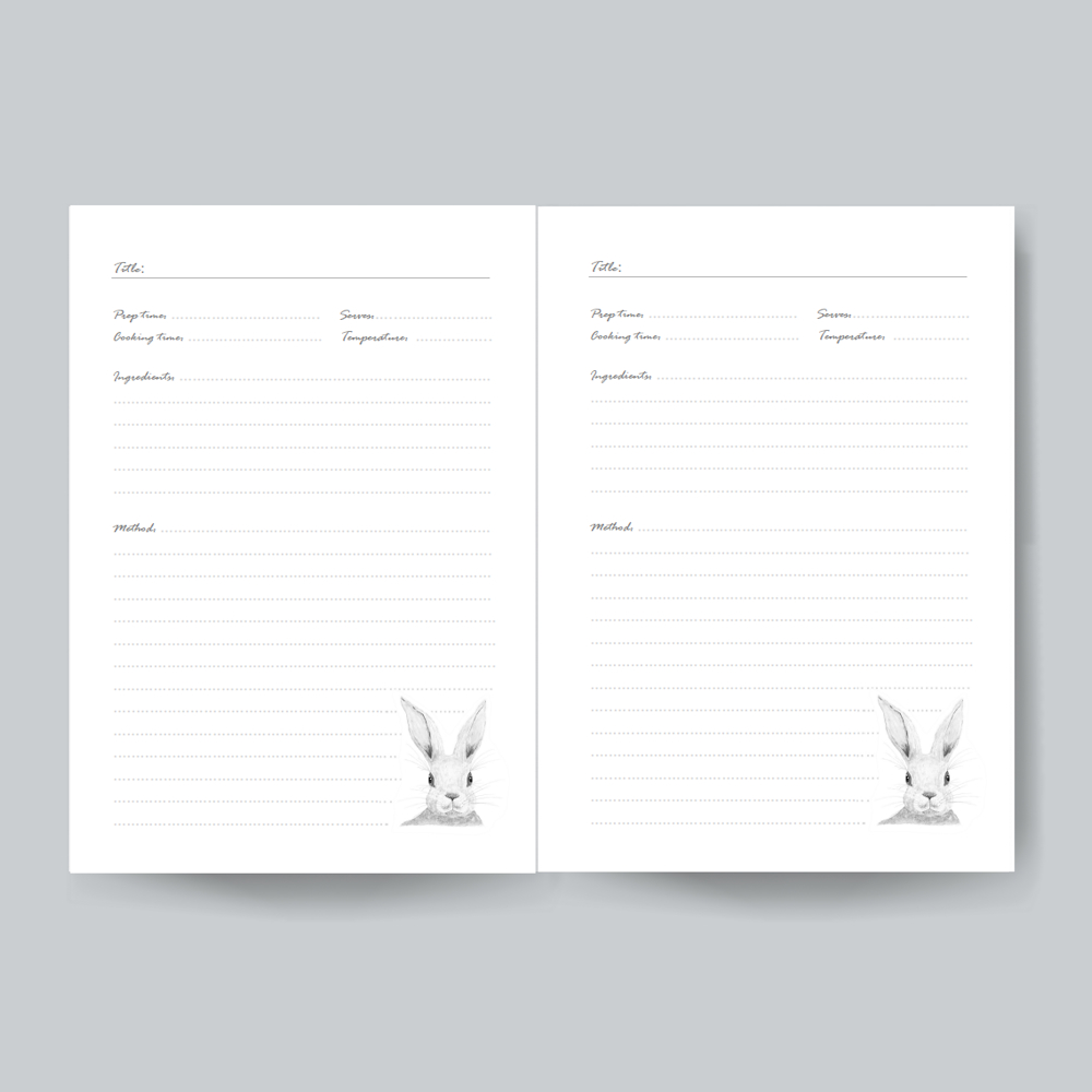 Each page has space for prep time, cooking time, serving information, cooking temperature, ingredients and method.