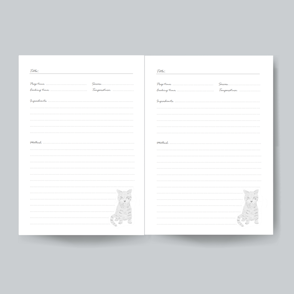 Each page has space for prep time, cooking time, serving information, cooking temperature, ingredients and method.