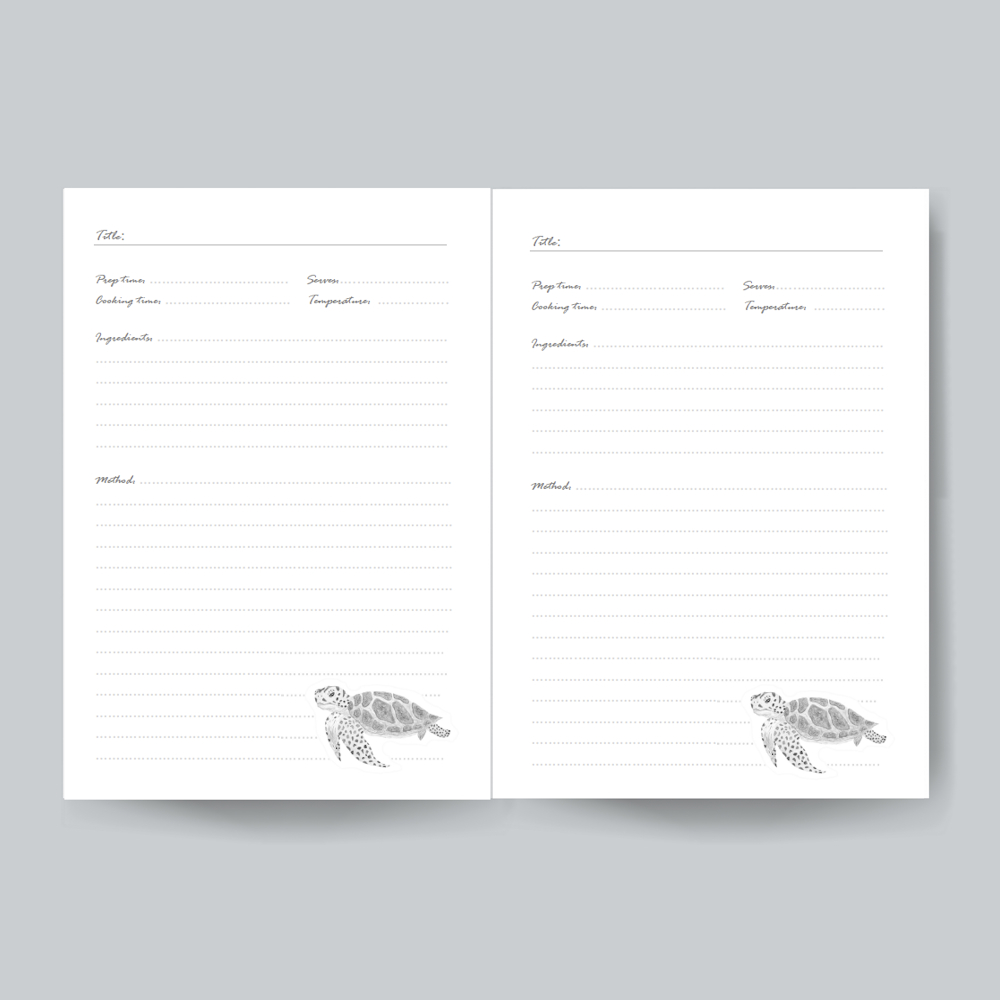 Each page has space for prep time, cooking time, serving information, cooking temperature, ingredients and method.
