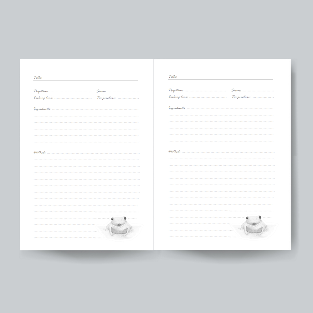 Each page has space for prep time, cooking time, serving information, cooking temperature, ingredients and method.