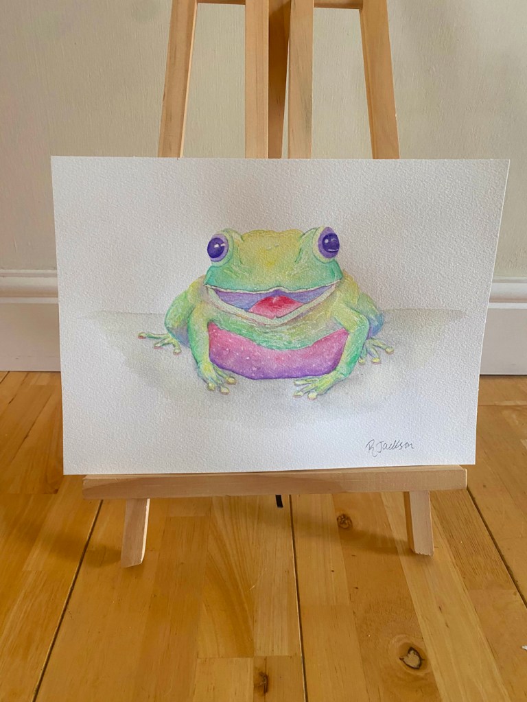 I originally painted this cute little fella in traditional green shades and then decided to redo it with a bit of colour.